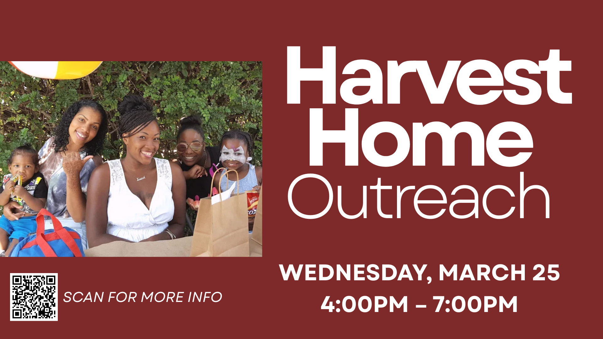 Please Note our New Date: Due to a scheduling shift, our Harvest Home Outreach is now scheduled for Wednesday, March 25.